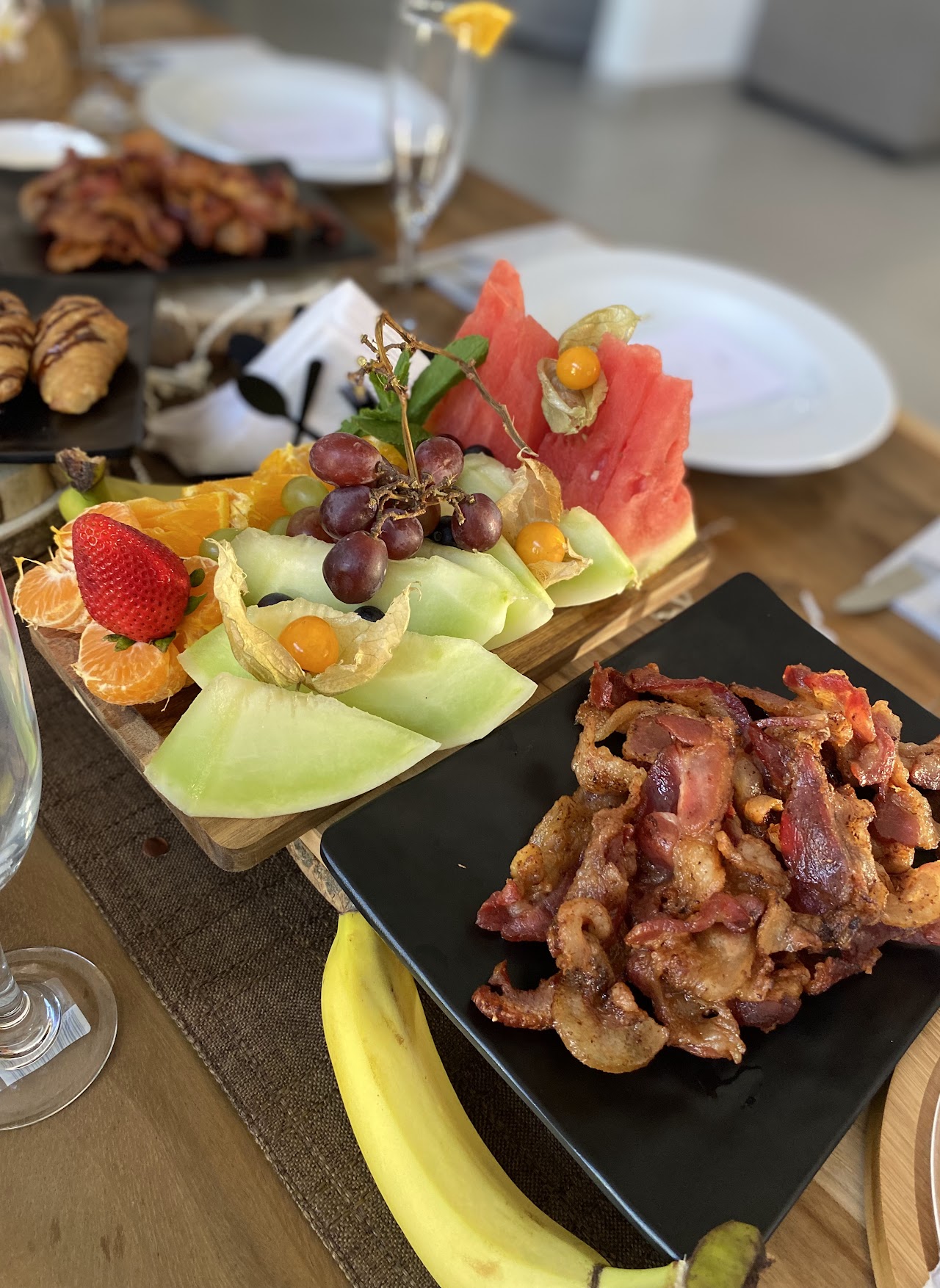 Gourmet breakfast selection. Featuring a vibrant platter of fresh seasonal fruits, including pineapple, watermelon, and grapes, accompanied by crispy bacon and quality cold cuts. A fresh and hearty option to start the day!