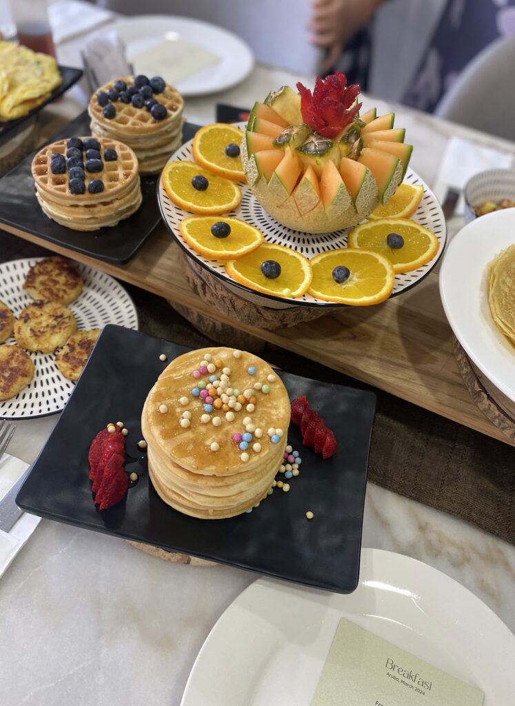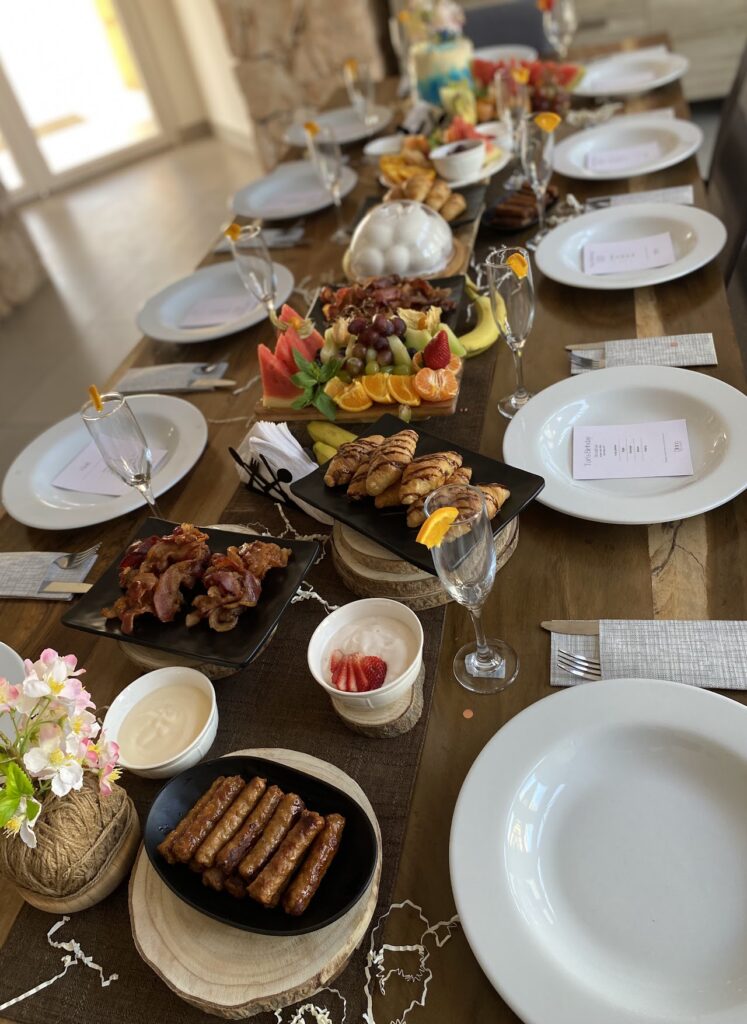 Complete table setup. The sophisticated presentation includes a variety of sweet and savory dishes, fresh fruit trays, and individual stations, ensuring a memorable breakfast experience for your group!